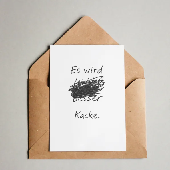 Eine Karte wie ein Seufzer. Wie ein Schulterklopfen mit Augenrollen. Sie sagt, was alle denken – aber keiner laut ausspricht. Für alle, die wissen: Das Meeting wird schlimm. Der Umzug anstrengend. Die Familienfeier… sagen wir, „herausfordernd“.