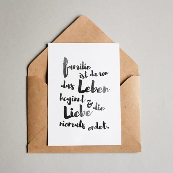 Schöne Typo-Postkarte mit Text in Wasserfarben-optik “Familie ist da wo das Leben beginnt und die Liebe niemals endet.”