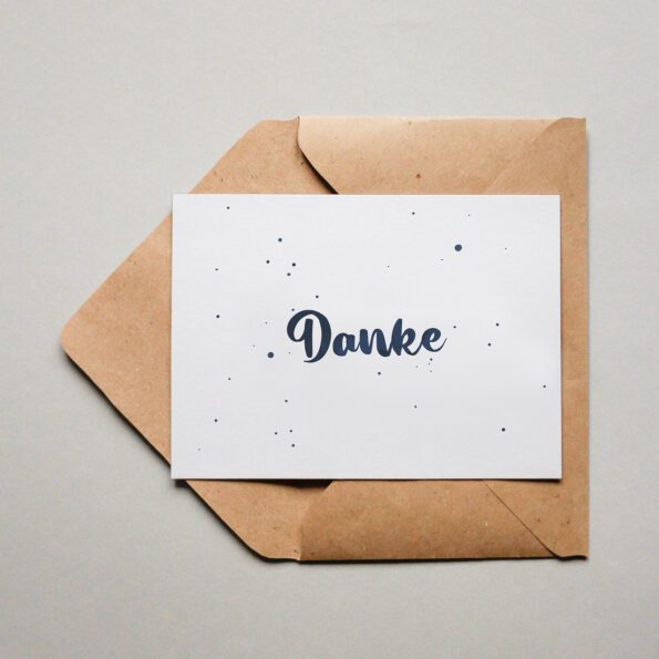 Unsere schlichte Designkarte “Danke” im Tintendesign und dem Format A6 (105x148mm) besteht aus einem extra dicken 580g/m² Designkarton mit feiner natürlicher Struktur. Die Karten sind “ungestrichen” und haben damit eine super-matte Oberfläche mit edler Haptik.